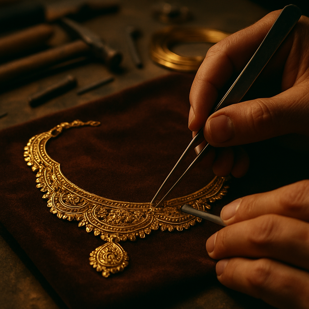 Each design came to life through the hands of master craftsmen. With tools passed down through generations, every bangle, necklace, and earring was shaped with precision, love, and tradition.