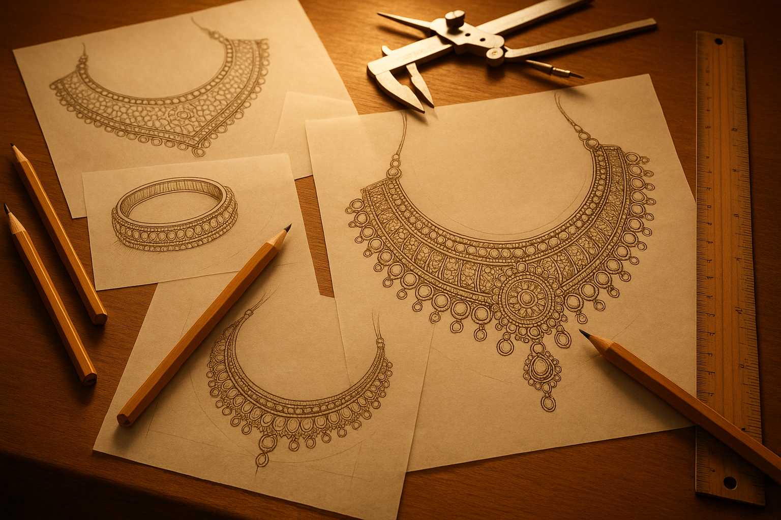 Our journey began with a dream to redefine gold jewellery that is blending timeless cultural motifs with modern aesthetics. Designers sketched with passion, envisioning pieces that speak of both heritage and elegance.
